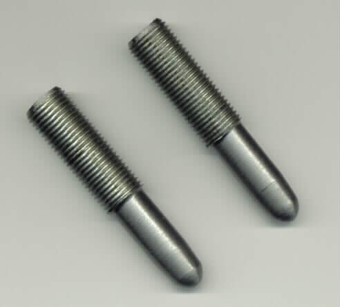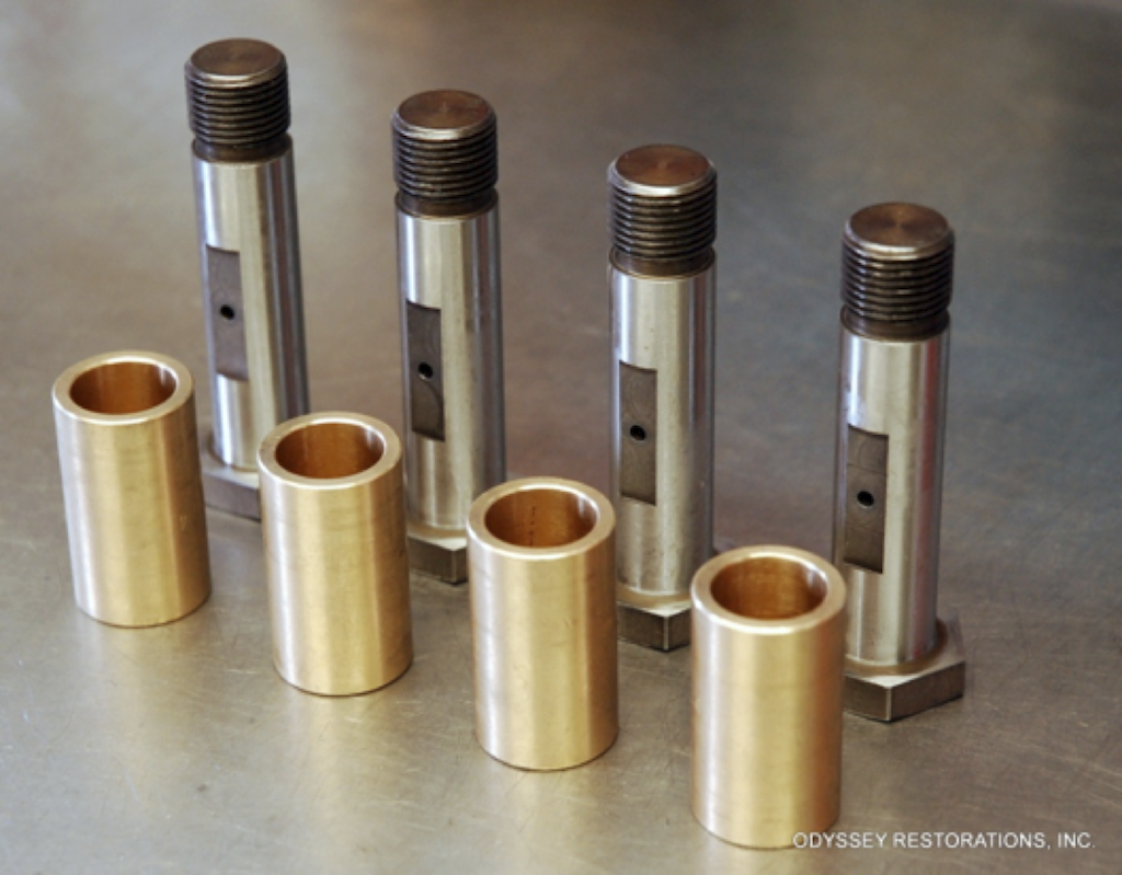 Bolts are made to original specifications (drawing #53051), are case hardened and ground. Solid 660 bronze bushings replace the OEM steel-backed bushings which badly wore the pivot bolt after the bronze liner was worn.