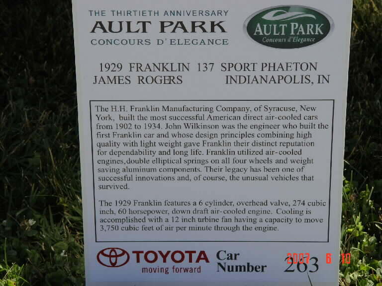 As an adjunct to Powell's talk the 1909 Franklin Series G Touring car owned by Christine Gray of Rochester Hills, Michigan, was displayed on the floor of Cobo Hall. This very attractive vehicle, recently restored, attracted a great deal of attention on the part of those attending the Congress. In his talk Powell expressed thanks to Christine Gray for making this fine example of an air-cooled car available for viewing. Also, he expressed thanks to Glen Gray, Christine's son, for delivering the car to the Congress.
